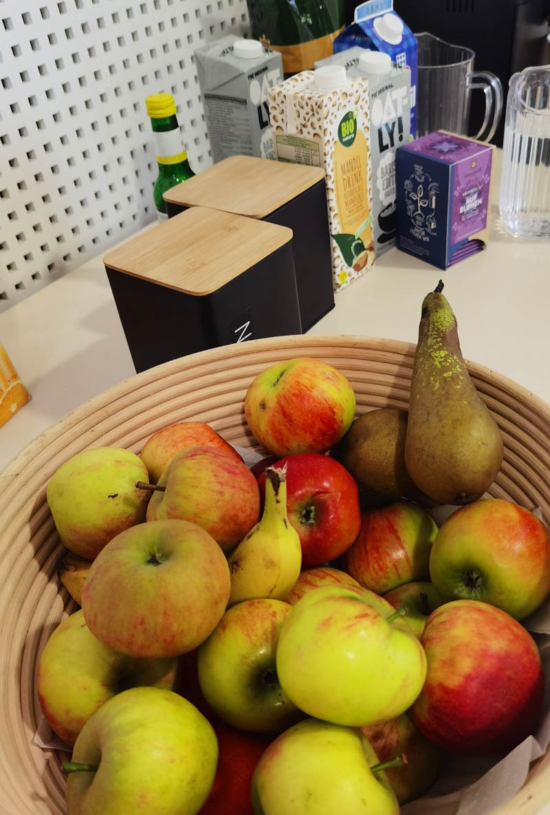 Der wunderbar prall gefüllt Obstkorb oder das Süßigkeiten-Snack-Buffeet verlocken zum Dauersnacken.