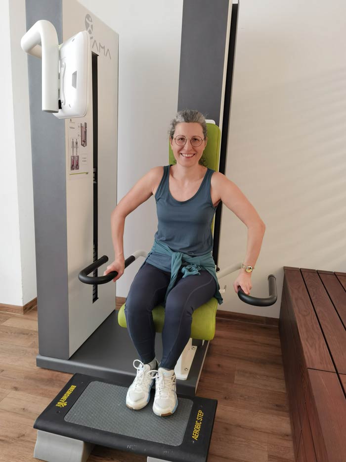 Eine Stunde nach der Kältetherapie bin ich zum Krafttraining und zu einer Einheit Sensomotorik eingeteilt. Ich fühle mich total leistungsfähig und fit. In der Trainingseinheit steigere gegenüber dem Vortag spielend jedes Gerät um 5 kg. In der Sensomotikstunde ist mein Gleichgewichtssinn besser ausgeprägt als in der letzten Einheit.