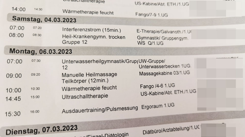 Während des Kuraufenthaltes ist man in einen straffen Therapieablauf eingeteilt. Am Anfang, mittendrin und am Ende gibt es ein ärztliches Gespräch. Ziele werden besprochen, es wird abgeklärt ob die Behandlungen gut tun oder ob zu adaptieren ist. Am Ende wird dokumentiert wie der Verlauf war und was sich in den 3 Wochen verändert hat.